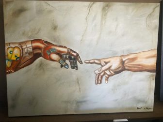 Oil painting inspired by Michelangelo’s famous painting “The Creation of Adam” – Artist Beu.T created the art piece “The creation of AI”!
